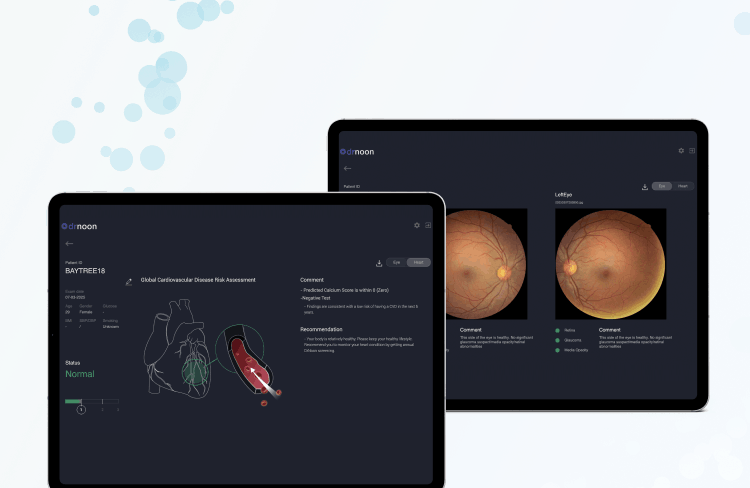 Dr.Noon is our AI retinal screening platform. Using a routine fundus image, it delivers dual insights: eye screening for key retinal findings and an instant cardiovascular risk assessment.